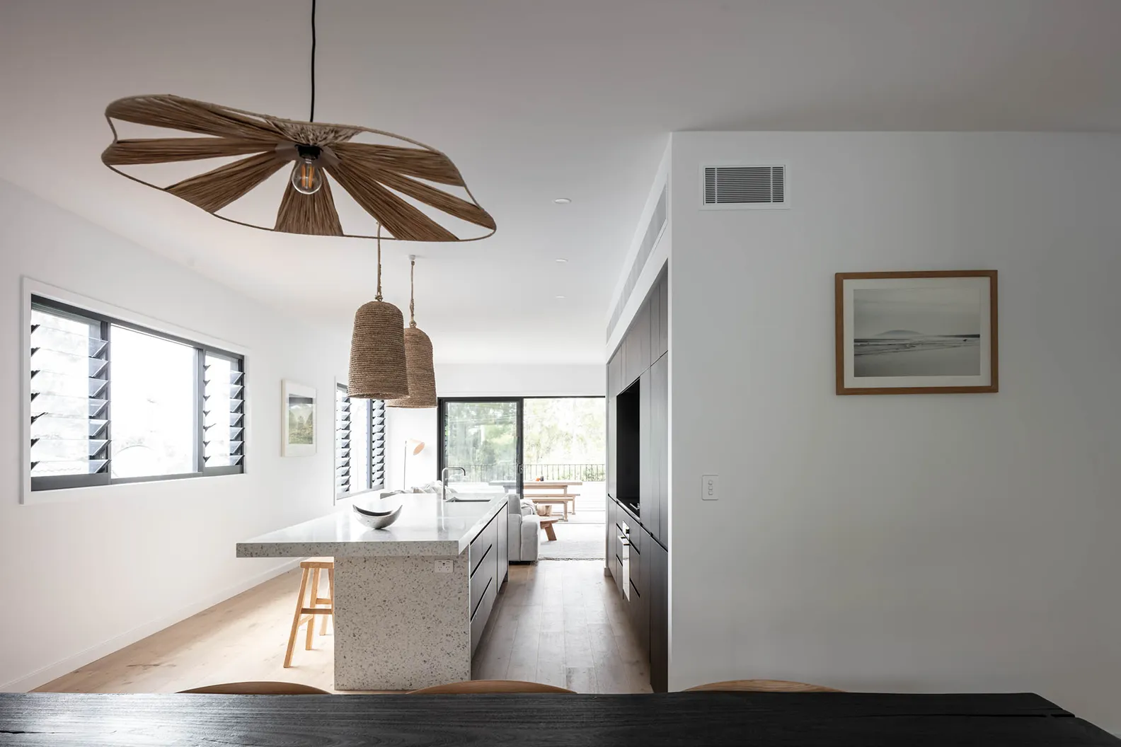 A functional kitchen design with natural textures and timeless coastal style in Gerroa, NSW.